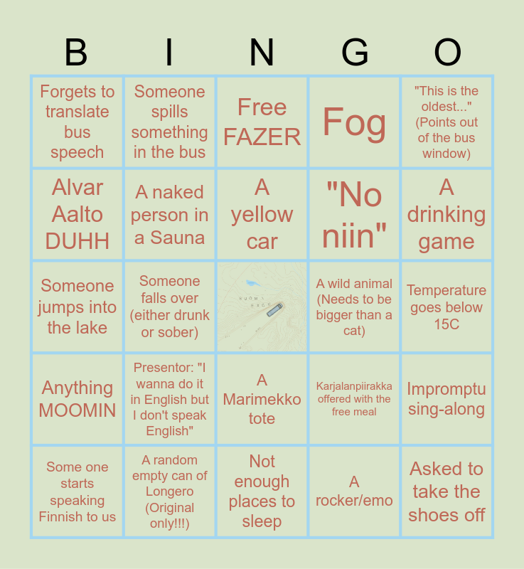 This bingo card has a free space and 24 words: Presentor: "I wanna do it in English but I don't speak English", A random empty can of Longero (Original only!!!), A yellow car, Some one starts speaking Finnish to us, "This is the oldest..." (Points out of the bus window), Forgets to translate bus speech, Alvar Aalto DUHH, Someone spills something in the bus, A wild animal (Needs to be bigger than a cat), A Marimekko tote, "No niin", Someone jumps into the lake, Karjalanpiirakka offered with the free meal, Impromptu sing-along, A naked person in a Sauna, A rocker/emo, Temperature goes below 15C, Free FAZER, A drinking game, Someone falls over (either drunk or sober), Asked to take the shoes off, Anything MOOMIN, Fog and Not enough places to sleep.