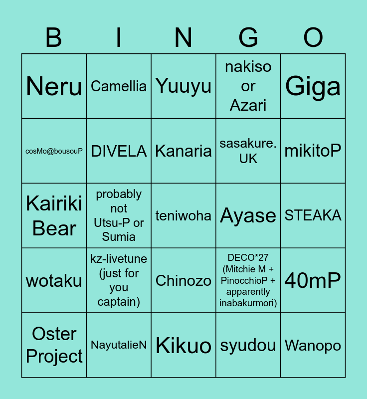 This bingo card has 25 words: kz-livetune (just for you captain), Kikuo, Kanaria, Oster Project, Giga, Neru, cosMo@bousouP, Camellia, Ayase, Chinozo, sasakure. UK, Kairiki Bear, DECO*27 (Mitchie M + PinocchioP + apparently inabakurmori), 40mP, DIVELA, Wanopo, STEAKA, Yuuyu, mikitoP, probably not Utsu-P or Sumia, teniwoha, NayutalieN, wotaku, nakiso or Azari and syudou.