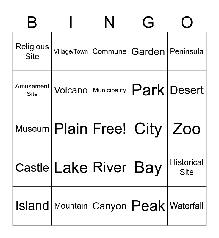 This bingo card has a free space and 24 words: Lake, Mountain, Municipality, Island, Peninsula, Religious Site, Amusement Site, Village/Town, City, River, Park, Museum, Bay, Historical Site, Volcano, Peak, Zoo, Commune, Desert, Plain, Waterfall, Castle, Garden and Canyon.