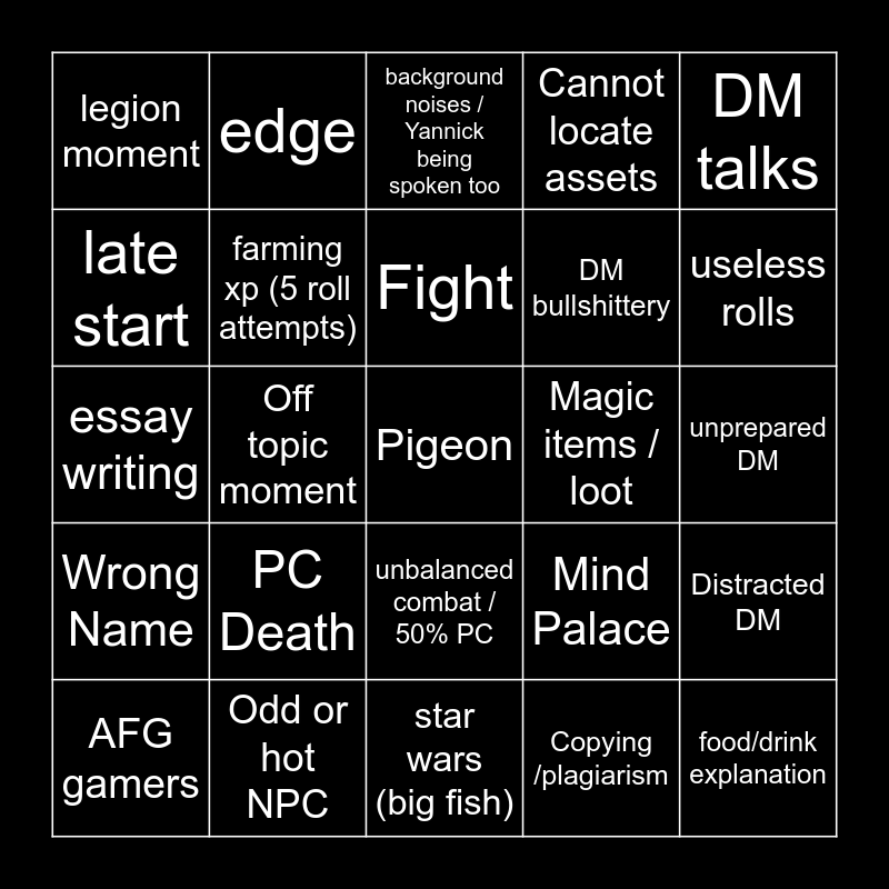 This bingo card has 25 words: PC Death, star wars (big fish), Fight, AFG gamers, DM talks, legion moment, late start, edge, Magic items / loot, unbalanced combat / 50% PC, DM bullshittery, essay writing, Mind Palace, Distracted DM, farming xp (5 roll attempts), food/drink explanation, unprepared DM, background noises / Yannick being spoken too, useless rolls, Off topic moment, Pigeon, Odd or hot NPC, Wrong Name, Cannot locate assets and Copying /plagiarism.