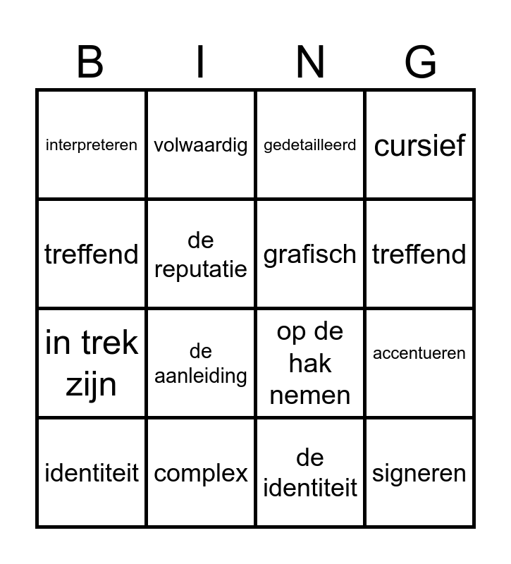 This bingo card has 20 words: accentueren, De context, gedetailleerd, de strekking, identiteit, treffend, complex, interpreteren, in trek zijn, volwaardig, de aanleiding, op de hak nemen, de reputatie, signeren, grafisch, de cartoon, treffend, cursief, de identiteit and verbeelden.