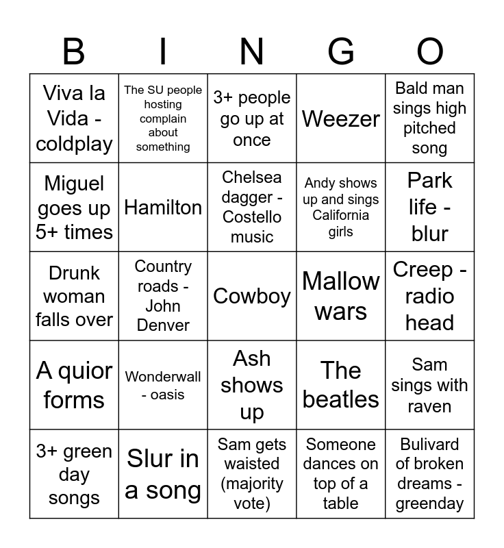 This bingo card has a free space and 24 words: Wonderwall - oasis, Slur in a song, Chelsea dagger - Costello music, 3+ green day songs, Bald man sings high pitched song, Viva la Vida - coldplay, Miguel goes up 5+ times, The SU people hosting complain about something, Mallow wars, Ash shows up, Andy shows up and sings California girls, Drunk woman falls over, The beatles, Sam sings with raven, Hamilton, Someone dances on top of a table, Creep - radio head, 3+ people go up at once, Park life - blur, Country roads - John Denver, Bulivard of broken dreams - greenday, A quior forms, Weezer and Sam gets waisted (majority vote).