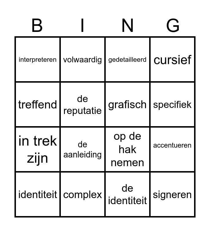 This bingo card has 20 words: accentueren, De context, gedetailleerd, de strekking, identiteit, treffend, complex, interpreteren, in trek zijn, volwaardig, de aanleiding, op de hak nemen, de reputatie, signeren, grafisch, de cartoon, specifiek, cursief, de identiteit and verbeelden.