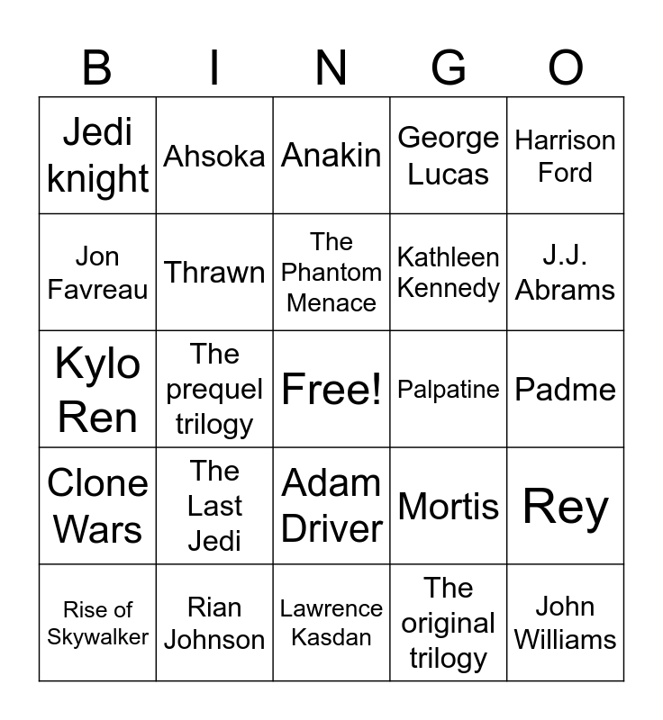 This bingo card has a free space and 27 words: Mortis, Dave Filoni, Kathleen Kennedy, Lawrence Kasdan, Jon Favreau, Anakin, Ahsoka, Clone Wars, Palpatine, Rey, Kylo Ren, George Lucas, Rise of Skywalker, Rian Johnson, J.J. Abrams, lightsaber, Thrawn, The Phantom Menace, The Last Jedi, Jedi knight, Padme, The original trilogy, The prequel trilogy, John Williams, Adam Driver, Harrison Ford and Disney.