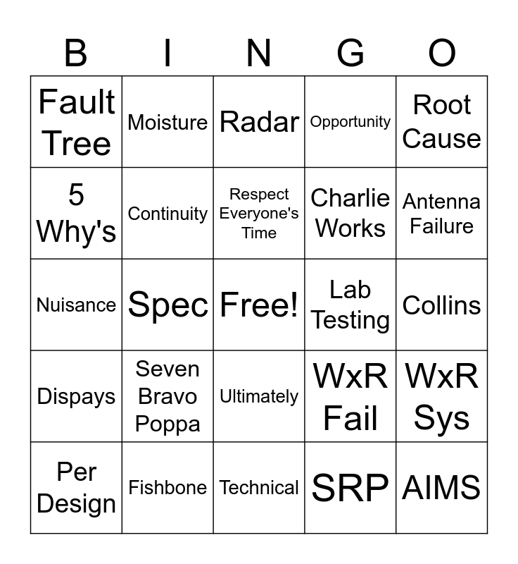 This bingo card has a free space and 24 words: Seven Bravo Poppa, Fishbone, Respect Everyone's Time, Per Design, Root Cause, Fault Tree, 5 Why's, Moisture, Lab Testing, Ultimately, Charlie Works, Nuisance, WxR Fail, WxR Sys, Continuity, SRP, Collins, Radar, Antenna Failure, Spec, AIMS, Dispays, Opportunity and Technical.