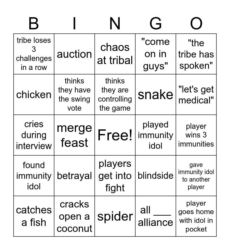 This bingo card has a free space and 27 words: blindside, fake idol, snake, spider, chicken, chaos at tribal, auction, found immunity idol, played immunity idol, gave immunity idol to another player, cries during interview, "come on in guys", catches a fish, cracks open a coconut, "let's get medical", player removed due to medical, thinks they have the swing vote, thinks they are controlling the game, betrayal, tribe loses 3 challenges in a row, player wins 3 immunities, all ___ alliance, merge feast, player goes home with idol in pocket, players get into fight, "the tribe has spoken" and Jeff visits camp.