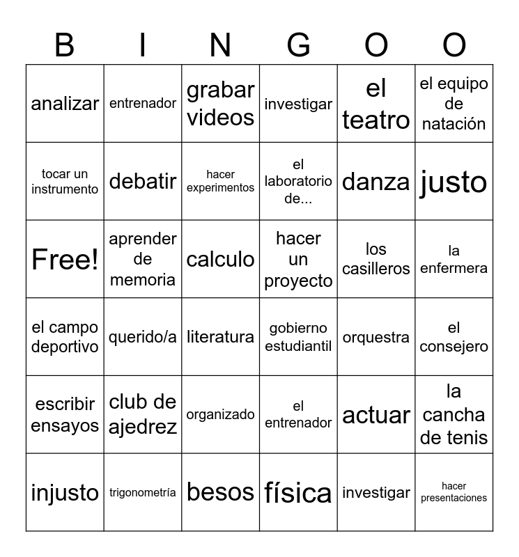 This bingo card has 36 words: el campo deportivo, querido/a, besos, el laboratorio de..., los casilleros, la enfermera, analizar, trigonometría, grabar videos, el entrenador, danza, el equipo de natación, escribir ensayos, aprender de memoria, hacer experimentos, investigar, actuar, el consejero, tocar un instrumento, debatir, literatura, gobierno estudiantil, orquestra, la cancha de tenis, Free!, entrenador, calculo, física, el teatro, justo, injusto, club de ajedrez, organizado, hacer un proyecto, investigar and hacer presentaciones.