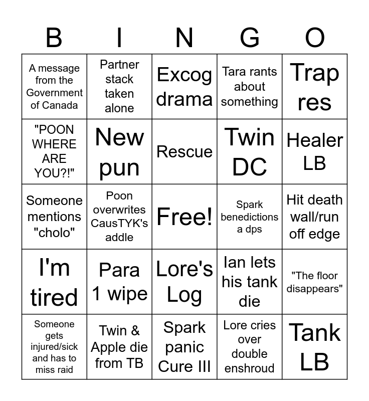 This bingo card has a free space and 29 words: Someone gets injured/sick and has to miss raid, P12P1 limit cut wipe, Poon overwrites CausTYK's addle, "PELOTON", A message from the Government of Canada, Excog drama, New pun, Para 1 wipe, Spark benedictions a dps, Twin & Apple die from TB, Hit death wall/run off edge, Tank LB, Spark panic Cure III, Lore cries over double enshroud, Healer LB, Someone mentions their screwed-up rotation, Lore's Log, I'm tired, Trap res, Someone mentions "cholo", Ian lets his tank die, Seabass comment, Twin DC, "POON WHERE ARE YOU?!", Tara rants about something, Partner stack taken alone, "The floor disappears", Rescue and Early pull.