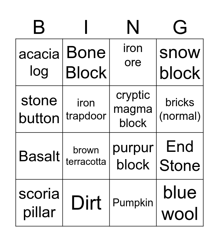 This bingo card has 16 words: Dirt, End Stone, iron ore, acacia log, Basalt, Bone Block, purpur block, Pumpkin, stone button, iron trapdoor, scoria pillar, snow block, brown terracotta, bricks (normal), cryptic magma block and blue wool.