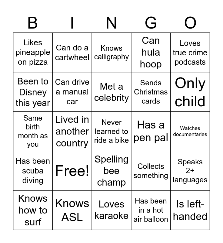This bingo card has a free space and 24 words: Free!, Knows ASL, Met a celebrity, Knows how to surf, Loves true crime podcasts, Likes pineapple on pizza, Been to Disney this year, Can do a cartwheel, Has a pen pal, Spelling bee champ, Sends Christmas cards, Same birth month as you, Collects something, Speaks 2+ languages, Can drive a manual car, Has been in a hot air balloon, Watches documentaries, Knows calligraphy, Only child, Lived in another country, Is left-handed, Has been scuba diving, Can hula hoop and Loves karaoke.