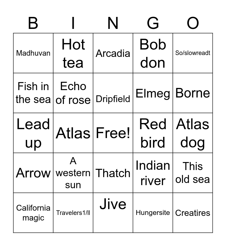 This bingo card has a free space and 24 words: California magic, A western sun, Dripfield, Hungersite, So/slowreadt, Madhuvan, Hot tea, Arcadia, Red bird, Atlas dog, Lead up, Echo of rose, Indian river, This old sea, Fish in the sea, Travelers1/ll, Jive, Bob don, Borne, Arrow, Atlas, Thatch, Elmeg and Creatires.
