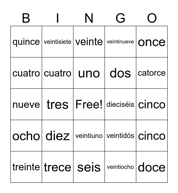This bingo card has a free space and 24 words: diez, trece, uno, treinte, once, quince, cuatro, veintisiete, dieciséis, veintiuno, dos, nueve, veintidós, cinco, cuatro, veintiocho, cinco, veinte, catorce, tres, doce, ocho, veintinueve and seis.