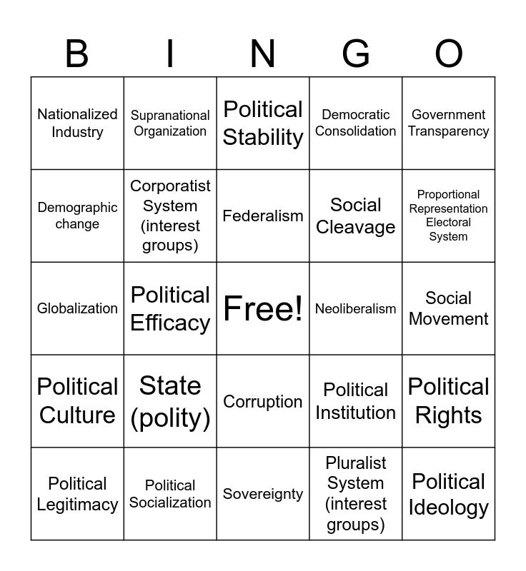 This bingo card has a free space and 35 words: Civil Liberties, Civil Service/ Bureaucracy, Civil Society, Corporatist System (interest groups), Corruption, Democratic Consolidation, Demographic change, Economic Liberalization, Federalism, First-past-the-post / Single-member Electoral System, Globalization, Government Transparency, Illiberal Democracy, Nation, Nationalized Industry, Neoliberalism, Pluralist System (interest groups), Political Efficacy, Political Culture, Political Ideology, Political Institution, Political Legitimacy, Political Rights, Political Socialization, Political Stability, Proportional Representation Electoral System, Regime, Rule of law, Social Cleavage, Social Movement, Social Welfare, Sovereignty, State (polity), Supranational Organization and Unitary System.