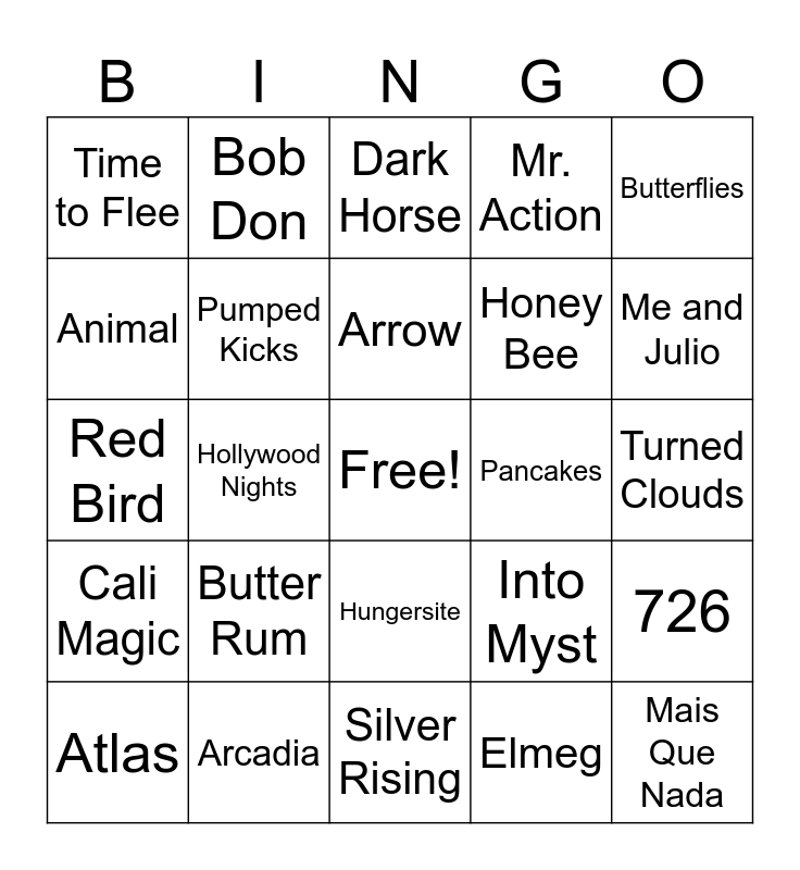 This bingo card has a free space and 24 words: Butter Rum, Arcadia, Arrow, Atlas, Butterflies, Time to Flee, Animal, Bob Don, Pancakes, Hungersite, Honey Bee, Red Bird, Into Myst, 726, Pumped Kicks, Elmeg, Turned Clouds, Dark Horse, Me and Julio, Hollywood Nights, Mais Que Nada, Cali Magic, Mr. Action and Silver Rising.