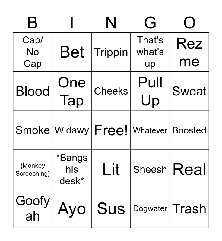This bingo card has a free space and 30 words: Ayo, Facts, Widawy, Bro/ Bruh, Cap/ No Cap, Trippin, One Tap, Lit, Whatever, Sus, Boosted, Trash, Dogwater, Lowkey, Sweat, W, Sheesh, {Monkey Screeching}, *Bangs his desk*, Rez me, Smoke, On God, Bet, Pull Up, Blood, That's what's up, Real, Goofy ah, Cheeks and You right.