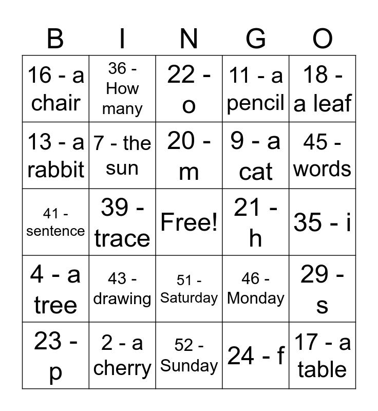 This bingo card has a free space and 62 words: 1 - a cow, 2 - a cherry, 3 - a boy, 4 - a tree, 5 - a girl, 6 - an apple, 7 - the sun, 8 - a factory, 9 - a cat, 10- a dog, 11 - a pencil, 12 - a pen, 13 - a rabbit, 14 - a koala, 15 - the moon, 16 - a chair, 17 - a table, 18 - a leaf, 19 - circle, 20 - m, 21 - h, 22 - o, 23 - p, 24 - f, 25 - p, 26 - x, 27 - v, 28 - c, 29 - s, 30 - u, 31 - z, 32 - n, 33 - y, 34 - n, 35 - i, 36 - How many, 37 - Complete, 38 - with, 39 - trace, 40 - copy, 41 - sentence, 42 - connect, 43 - drawing, 44 - colour, 45 - words, 46 - Monday, 47 - Tuesday, 48 - Wednesday, 49 - Thursday, 50 - Friday, 51 - Saturday, 52 - Sunday, 53 - I, 54 - My name is, 55 - date, 56 - letters, 57 - a, 58 - the, 59 - September, 60 - all, 61 - star and 62 - corresponding.