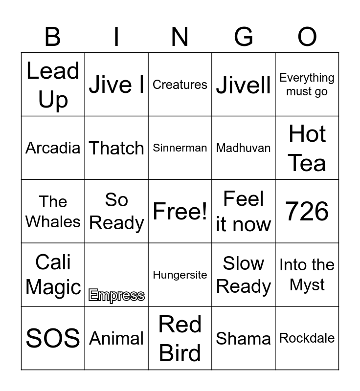 This bingo card has a free space and 24 words: Empress, Animal, Sinnerman, SOS, Everything must go, Lead Up, Arcadia, Jive l, Feel it now, Hungersite, Madhuvan, The Whales, Slow Ready, Into the Myst, Thatch, Shama, 726, Creatures, Hot Tea, So Ready, Rockdale, Cali Magic, Jivell and Red Bird.