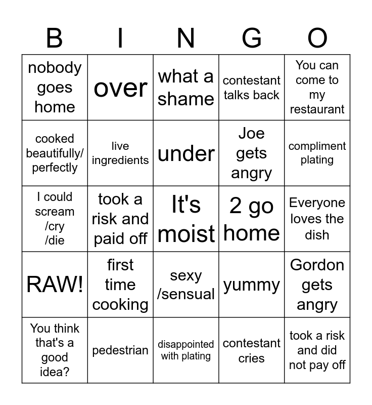 This bingo card has a free space and 24 words: first time cooking, pedestrian, under, You think that's a good idea?, You can come to my restaurant, nobody goes home, cooked beautifully/ perfectly, over, 2 go home, sexy /sensual, Joe gets angry, I could scream /cry /die, yummy, Gordon gets angry, live ingredients, contestant cries, Everyone loves the dish, what a shame, compliment plating, took a risk and paid off, took a risk and did not pay off, RAW!, contestant talks back and disappointed with plating.
