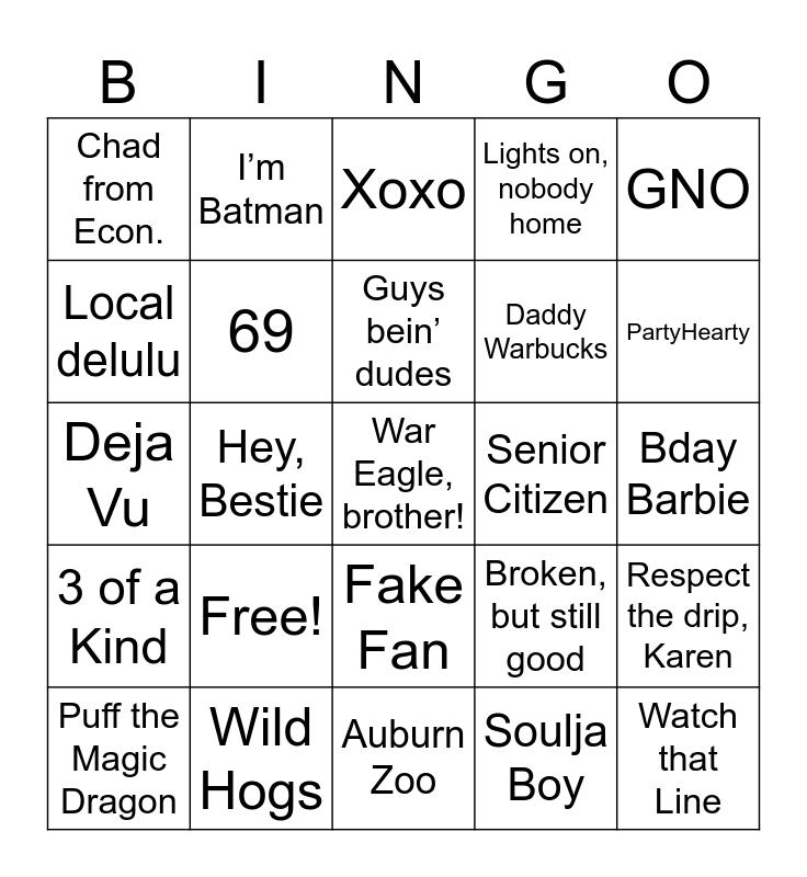 This bingo card has 25 words: Free!, Auburn Zoo, Guys bein’ dudes, Puff the Magic Dragon, GNO, Chad from Econ., Local delulu, I’m Batman, Senior Citizen, Fake Fan, Daddy Warbucks, Deja Vu, Broken, but still good, Respect the drip, Karen, 69, Watch that Line, Bday Barbie, Xoxo, PartyHearty, Hey, Bestie, War Eagle, brother!, Wild Hogs, 3 of a Kind, Lights on, nobody home and Soulja Boy.