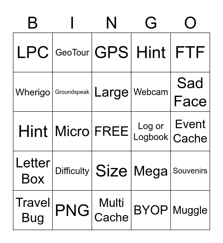 This bingo card has a free space and 44 words: Terrian, Muggle, Mystery Cache, Travel Bug, SWAG, BYOP, GPS, DNF, FTF, PNG, Hint, Log or Logbook, Size, Difficulty, CITO, Multi Cache, Smiley, Hint, Coordinates, Sad Face, GeoTour, Adventure Lab, TFTC, LPC, Puzzle Cache, Event Cache, Earth Cache, Traditional Cache, Mega, Letter Box, Virtual Cache, Souvenirs, Challenges, Can of Beans, Micro, Small, Other, Regular, Large, Wherigo, Webcam, Giga, Groundspeak and Original Stash Tribute Plaque.