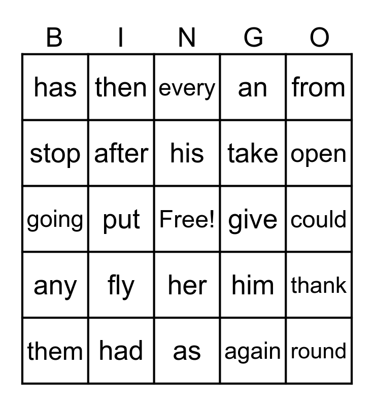 This bingo card has a free space and 24 words: fly, had, his, them, from, has, stop, then, give, her, take, going, him, thank, after, again, could, every, open, put, round, any, an and as.