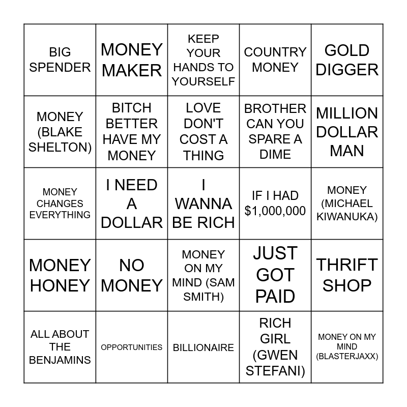 This bingo card has 57 words: ABOUT THE MONEY, ALL ABOUT THE BENJAMINS, BEER MONEY, BIG SPENDER, BILLIONAIRE, BILLS, BILLS, BILLS, BITCH BETTER HAVE MY MONEY, BRASS IN POCKET, BROTHER CAN YOU SPARE A DIME, CAN'T BUY ME LOVE, COUNTRY MONEY, DIRTY DEEDS DONE DIRT CHEAP, EARNED IT, EASY MONEY, FOR THE LOVE OF MONEY, FREE MONEY, GOLD DIGGER, I NEED A DOLLAR, I USED TO HAVE MONEY ONE TIME, I WANNA BE RICH, IF I HAD $1,000,000, IF I WERE A RICH MAN, JUST GOT PAID, KEEP YOUR HANDS TO YOURSELF, LAST DOLLAR, LOVE DON'T COST A THING, MAKE THE MONEY, MATERIAL GIRL, MILLION DOLLAR MAN, MILLIONAIRE, MIND ON MY MONEY, MINIMUM WAGE, MO MONEY MO PROBLEMS, MONEY (PINK FLOYD), MONEY (MICHAEL KIWANUKA), MONEY (BLAKE SHELTON), MONEY(THE FLYING LIZARDS), MONEY CHANGES EVERYTHING, MONEY FOR NOTHING, MONEY HONEY, MONEY MAKER, MONEY ON MY MIND (SAM SMITH), MONEY ON MY MIND (BLASTERJAXX), MONEY, MONEY, MONEY, MONEYTALKS, NICKELS AND DIMES, NO MONEY, OPPORTUNITIES, PENNIES FROM HEAVEN, PRICE TAG, PUT YOUR MONEY WHERE YOUR MOUTH IS, RICH GIRL (GWEN STEFANI), RICH GIRL (DARYL HALL & JOHN OATES), SHE WORKS HARD FOR THE MONEY, TAKE THE MONEY AND RUN, THRIFT SHOP and TIME IS MONEY.