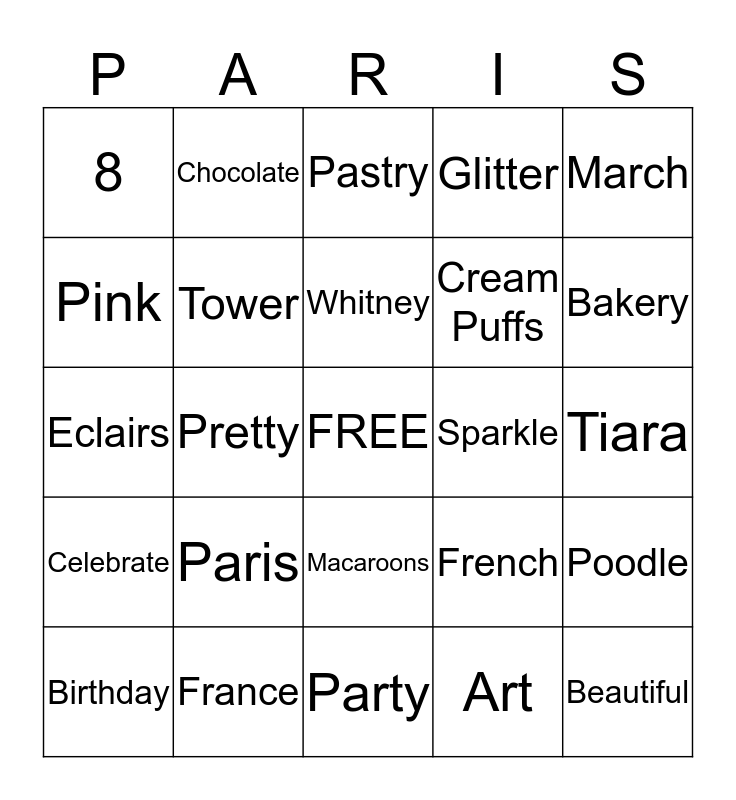 This bingo card has a free space and 24 words: Paris, France, Whitney, Birthday, March, 8, Pink, Chocolate, Sparkle, Macaroons, Cream Puffs, Eclairs, French, Poodle, Tower, Art, Tiara, Pastry, Bakery, Pretty, Beautiful, Celebrate, Glitter and Party.