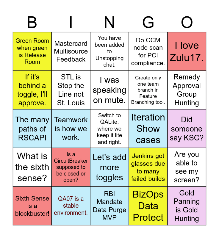 This bingo card has 29 words: Sixth Sense is a blockbuster!, Standups is where everyone sits down., Teamwork is how we work., Gold Panning is Gold Hunting, Green Room when green is Release Room, You have been added to Unstopping chat., STL is Stop the Line not St. Louis, Is a CircuitBreaker supposed to be closed or open?, Iteration Show cases, QA07 is a stable environment., Did someone say KSC?, Switch to QALite, where we keep it lite and right., RBI Mandate Data Purge MVP, BizOps Data Protect, Remedy Approval Group Hunting, Gold Panning should be Gold Planning, Let's add more toggles, What is the sixth sense?, I love Zulu17., The many paths of RSCAPI, Jenkins got glasses due to many failed builds, FBT is Continuous Trunk Integrator, Create only one team branch in Feature Branching tool., If it's behind a toggle, I'll approve., Do CCM node scan for PCI compliance., Mastercard Multisource Feedback, Are you able to see my screen?, I was speaking on mute. and Am I audible, can you hear me?.