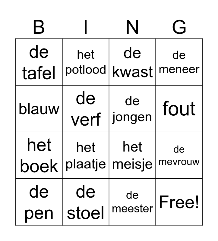 This bingo card has 23 words: Free!, goed, fout, groen, blauw, de tafel, de verf, het potlood, de pen, de meester, het plaatje, het boek, de cd, de juf, de stoel, de lijm, de kwast, het meisje, de jongen, de mevrouw, de meneer, de meester and de school.