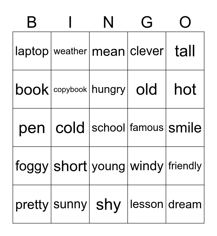 This bingo card has a free space and 24 words: short, sunny, hungry, pretty, tall, laptop, book, weather, famous, young, old, pen, windy, friendly, copybook, lesson, smile, mean, hot, cold, dream, foggy, clever and shy.