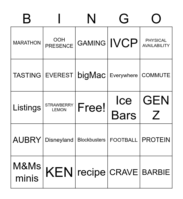 This bingo card has a free space and 25 words: Disneyland, recipe, bigMac, M&Ms minis, PHYSICAL AVAILABILITY, MARATHON, TASTING, OOH PRESENCE, Ice Bars, Blockbusters, Everywhere, Listings, FOOTBALL, PROTEIN, EVEREST, DOWNSIZING, GEN Z, GAMING, COMMUTE, STRAWBERRY LEMON, BARBIE, KEN, AUBRY, IVCP and CRAVE.