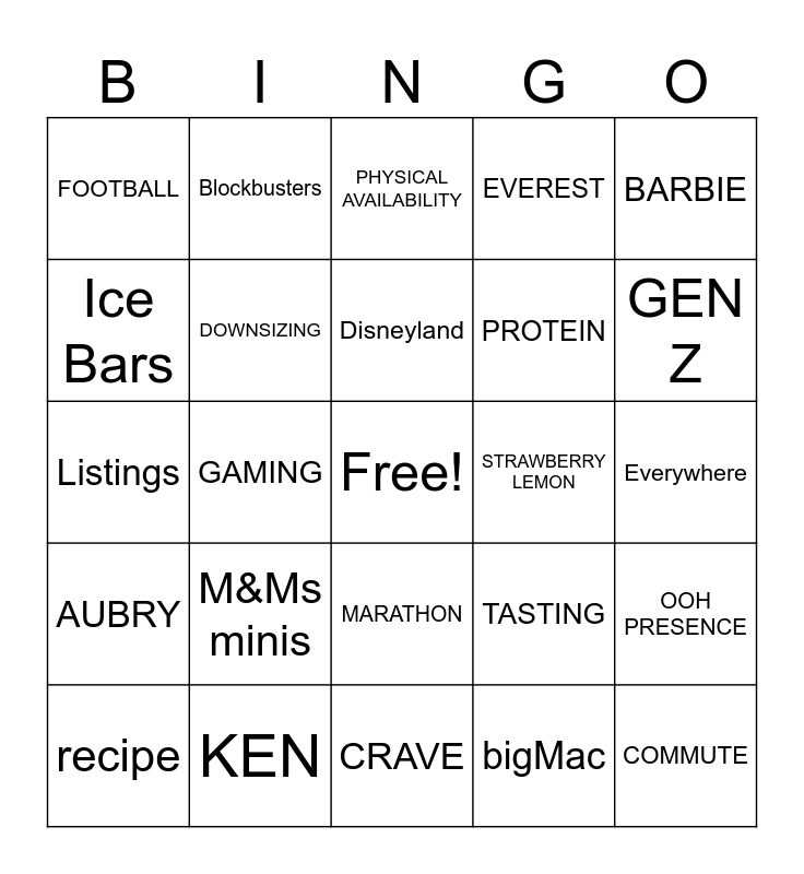 This bingo card has a free space and 25 words: M&Ms minis, CRAVE, Disneyland, recipe, BARBIE, FOOTBALL, Ice Bars, Blockbusters, STRAWBERRY LEMON, MARATHON, PROTEIN, Listings, TASTING, OOH PRESENCE, DOWNSIZING, IVCP, Everywhere, PHYSICAL AVAILABILITY, GEN Z, GAMING, COMMUTE, KEN, AUBRY, EVEREST and bigMac.