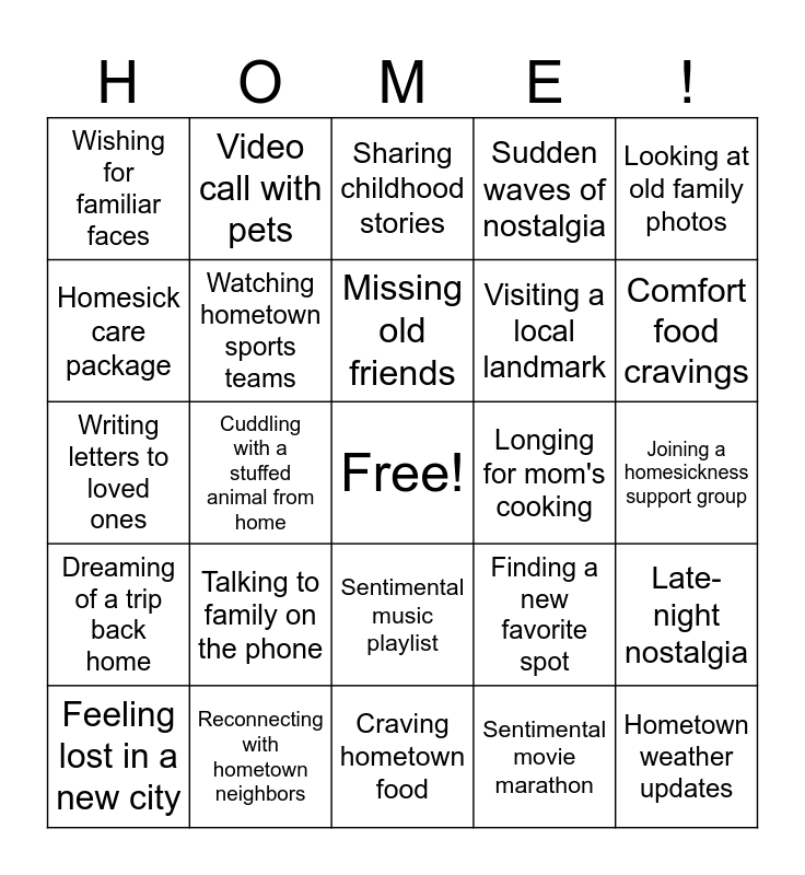 This bingo card has a free space and 25 words: Talking to family on the phone, Craving hometown food, Missing old friends, Feeling lost in a new city, Looking at old family photos, Wishing for familiar faces, Homesick care package, Video call with pets, Longing for mom's cooking, Sentimental music playlist, Visiting a local landmark, Writing letters to loved ones, Finding a new favorite spot, Late-night nostalgia, Watching hometown sports teams, Decorating your new space with mementos, Joining a homesickness support group, Sharing childhood stories, Comfort food cravings, Cuddling with a stuffed animal from home, Hometown weather updates, Reconnecting with hometown neighbors, Dreaming of a trip back home, Sudden waves of nostalgia and Sentimental movie marathon.