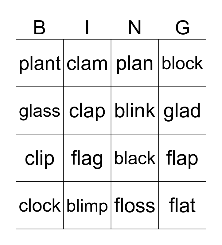 This bingo card has 18 words: flag, flat, plan, plant, black, block, clock, clam, glad, clip, floss, glass, flap, clap, blink, flip, blimp and click.
