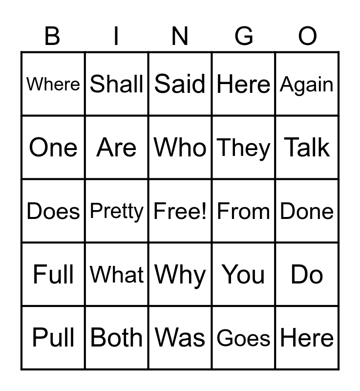 This bingo card has a free space and 27 words: You, Your, They, Was, One, Said, Shall, Full, From, Do, Does, Here, Pull, Both, Talk, Walk, Are, Who, What, Where, Done, Goes, Pretty, Here, Why, Again and Animal.