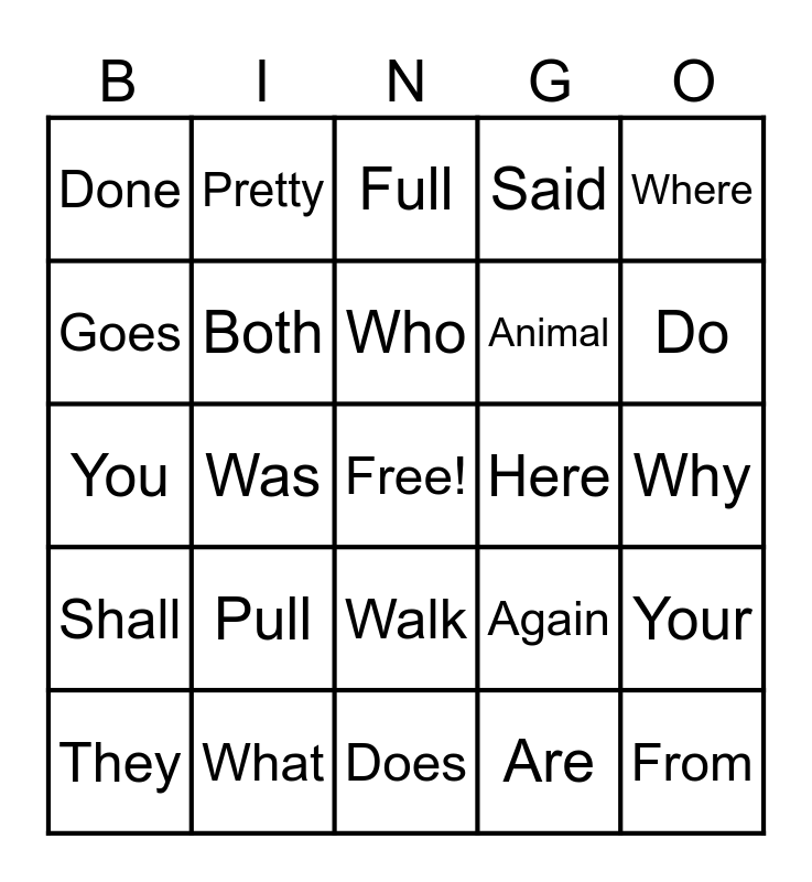 This bingo card has a free space and 26 words: Walk, Are, Who, What, Where, Done, Goes, Pretty, Why, Again, Animal, You, Your, They, Was, One, Said, Shall, Full, From, Do, Does, Here, Pull, Both and Talk.