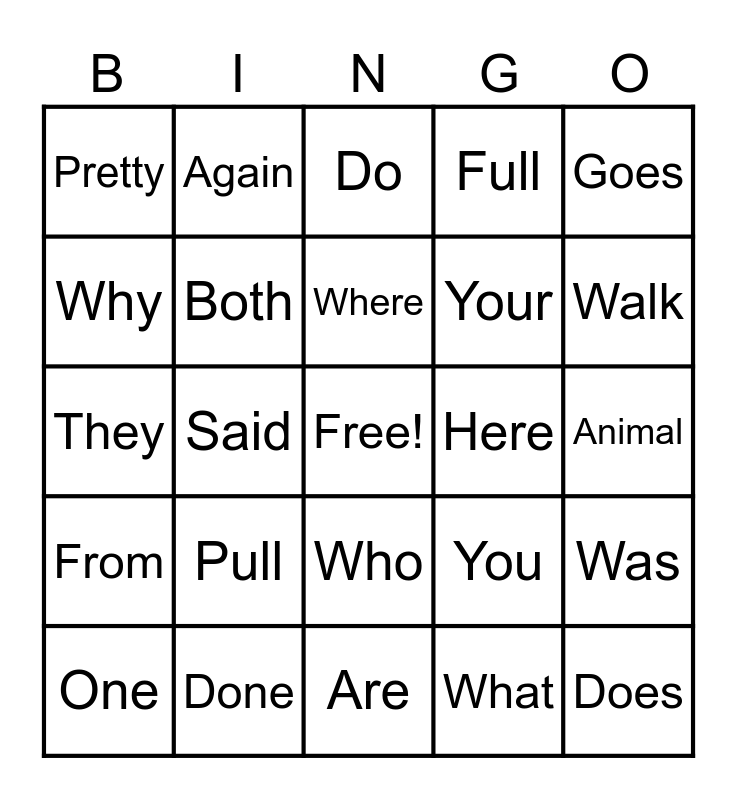 This bingo card has a free space and 26 words: Who, What, Where, Done, Goes, Pretty, Why, Again, Animal, You, Your, They, Was, One, Said, Shall, Full, From, Do, Does, Walk, Are, Here, Pull, Both and Talk.