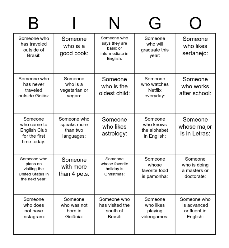 This bingo card has 30 words: Someone who was not born in Goiânia:, Someone whose favorite color is yellow:, Someone who speaks more than two languages:, Someone who is a first or second year at UFG:, Someone who has traveled outside of Brasil:, Someone who says they are basic or intermediate in English:, Someone who is a vegetarian or vegan:, Someone whose favorite holiday is Christmas:, Someone who knows the alphabet in English:, Someone who has visited the south of Brasil:, Someone whose major is in Letras:, Someone who likes astrology:, Someone who likes playing videogames:, Someone who is advanced or fluent in English:, Someone who works after school:, Someone who plays on a sports team:, Someone whose favorite food is pamonha:, Someone who plans on visiting the United States in the next year:, Someone with more than 4 pets:, Someone who likes sertanejo:, Someone who came to English Club for the first time today:, Someone who plays a musical instrument:, Someone who is a good cook:, Someone who watches Netflix everyday:, Someone who has never traveled outside Goiás:, Someone who will graduate this year:, Someone who is doing a masters or doctorate:, Someone who does not have Instagram:, Someone who is the oldest child: and Someone who hates sertanejo:.