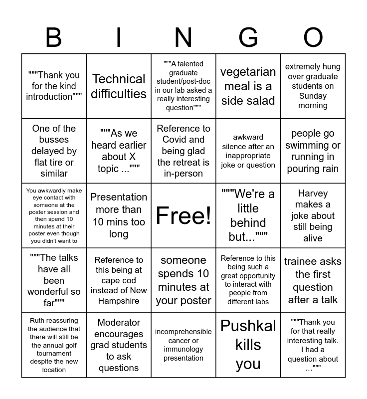 This bingo card has a free space and 25 words: Reference to this being at cape cod instead of New Hampshire, incomprehensible cancer or immunology presentation, Reference to Covid and being glad the retreat is in-person, Ruth reassuring the audience that there will still be the annual golf tournament despite the new location, extremely hung over graduate students on Sunday morning, """Thank you for the kind introduction""", One of the busses delayed by flat tire or similar, Technical difficulties, """We're a little behind but...""", someone spends 10 minutes at your poster, awkward silence after an inappropriate joke or question, You awkwardly make eye contact with someone at the poster session and then spend 10 minutes at their poster even though you didn't want to, Reference to this being such a great opportunity to interact with people from different labs, trainee asks the first question after a talk, """As we heard earlier about X topic ...""", covid outbreak, Harvey makes a joke about still being alive, """A talented graduate student/post-doc in our lab asked a really interesting question""", people go swimming or running in pouring rain, Presentation more than 10 mins too long, """Thank you for that really interesting talk. I had a question about …""", Moderator encourages grad students to ask questions, """The talks have all been wonderful so far""", vegetarian meal is a side salad and Pushkal kills you.