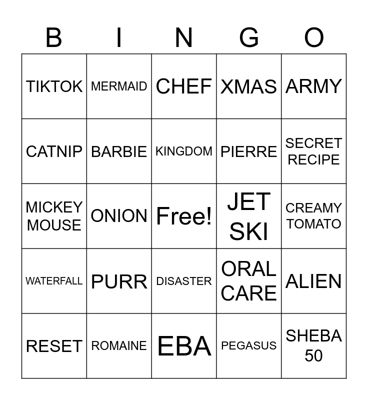 This bingo card has a free space and 25 words: PURR, EBA, KINGDOM, RESET, ARMY, TIKTOK, CATNIP, MERMAID, JET SKI, DISASTER, PIERRE, MICKEY MOUSE, ORAL CARE, ALIEN, BARBIE, THAI, CREAMY TOMATO, CHEF, SECRET RECIPE, ONION, SHEBA 50, ROMAINE, WATERFALL, XMAS and PEGASUS.