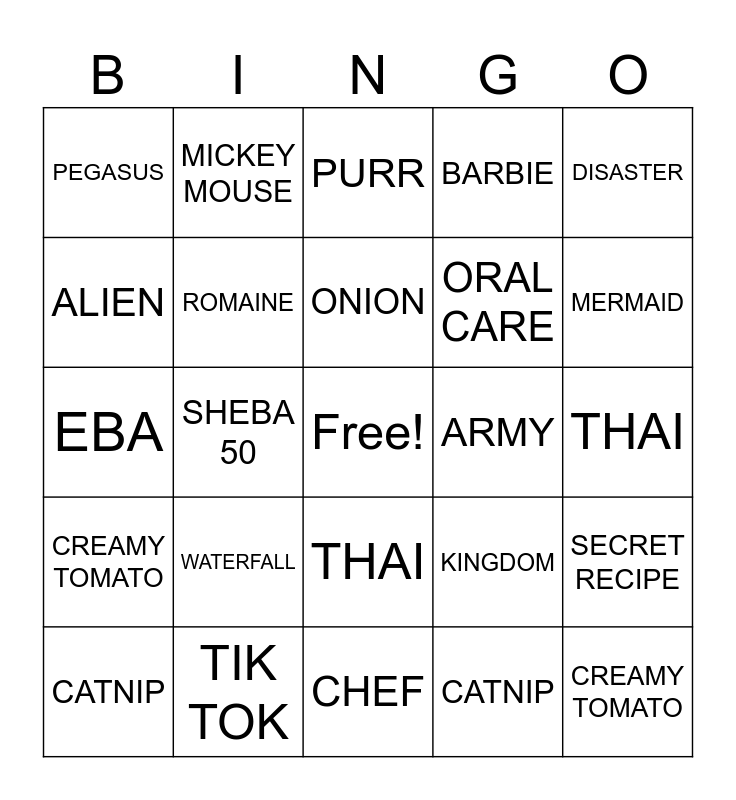This bingo card has a free space and 29 words: CATNIP, TIK TOK, SHEBA 50, XMAS, PEGASUS, PURR, ROMAINE, WATERFALL, ARMY, TIK TOK, THAI, CREAMY TOMATO, CHEF, CATNIP, MERMAID, JET SKI, THAI, CREAMY TOMATO, DISASTER, EBA, KINGDOM, RESET, ORAL CARE, ALIEN, BARBIE, MICKEY MOUSE, SECRET RECIPE, ONION and PIERRE.