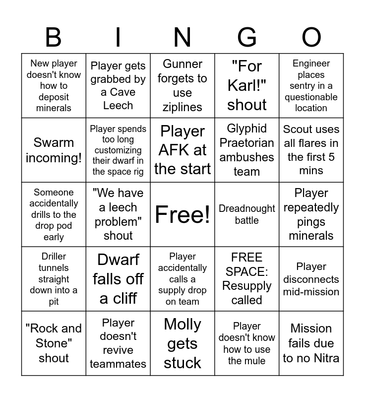 This bingo card has a free space and 25 words: Dwarf falls off a cliff, Molly gets stuck, Player AFK at the start, "Rock and Stone" shout, Engineer places sentry in a questionable location, New player doesn't know how to deposit minerals, Swarm incoming!, Player gets grabbed by a Cave Leech, Dreadnought battle, Player accidentally calls a supply drop on team, Glyphid Praetorian ambushes team, Someone accidentally drills to the drop pod early, FREE SPACE: Resupply called, Player disconnects mid-mission, Player spends too long customizing their dwarf in the space rig, Engineer runs out of platforms, Player repeatedly pings minerals, Gunner forgets to use ziplines, Scout uses all flares in the first 5 mins, "We have a leech problem" shout, Mission fails due to no Nitra, Player doesn't revive teammates, Driller tunnels straight down into a pit, "For Karl!" shout and Player doesn't know how to use the mule.
