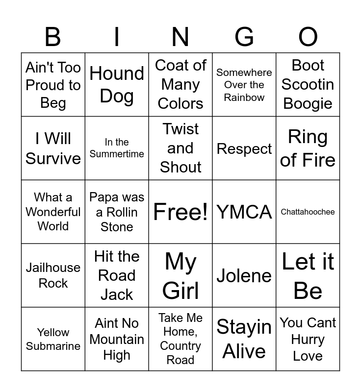 This bingo card has a free space and 28 words: Let it Be, Pretty Woman, Respect, Stayin Alive, I Will Survive, Coat of Many Colors, Hound Dog, Jailhouse Rock, YMCA, Yellow Submarine, What a Wonderful World, Somewhere Over the Rainbow, Aint No Mountain High, Take Me Home, Country Road, Ring of Fire, 9 to 5, Hit the Road Jack, In the Summertime, Twist and Shout, My Girl, Ain't Too Proud to Beg, I Heard It Through the Grapevine, You Cant Hurry Love, Papa was a Rollin Stone, Chattahoochee, Jolene, Boot Scootin Boogie and I Walk the Line.
