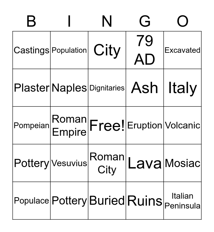 This bingo card has a free space and 24 words: Vesuvius, Pottery, Dignitaries, Populace, Excavated, Castings, Plaster, Population, Eruption, Roman City, Ash, Pompeian, Lava, Mosiac, Naples, Ruins, Volcanic, City, Italy, Roman Empire, Italian Peninsula, Pottery, 79 AD and Buried.
