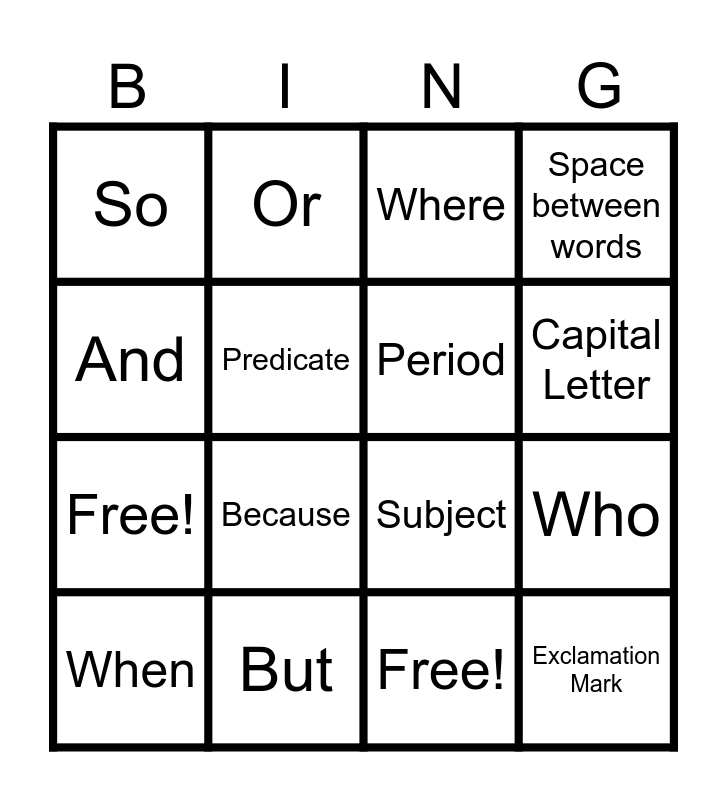 This bingo card has 20 words: Who, What, Where, Why, When, And, But, So, Free!, Or, Because, Subject, Predicate, Exclamation Mark, Period, Question Mark, Capital Letter, Space between words, Free! and Free!.