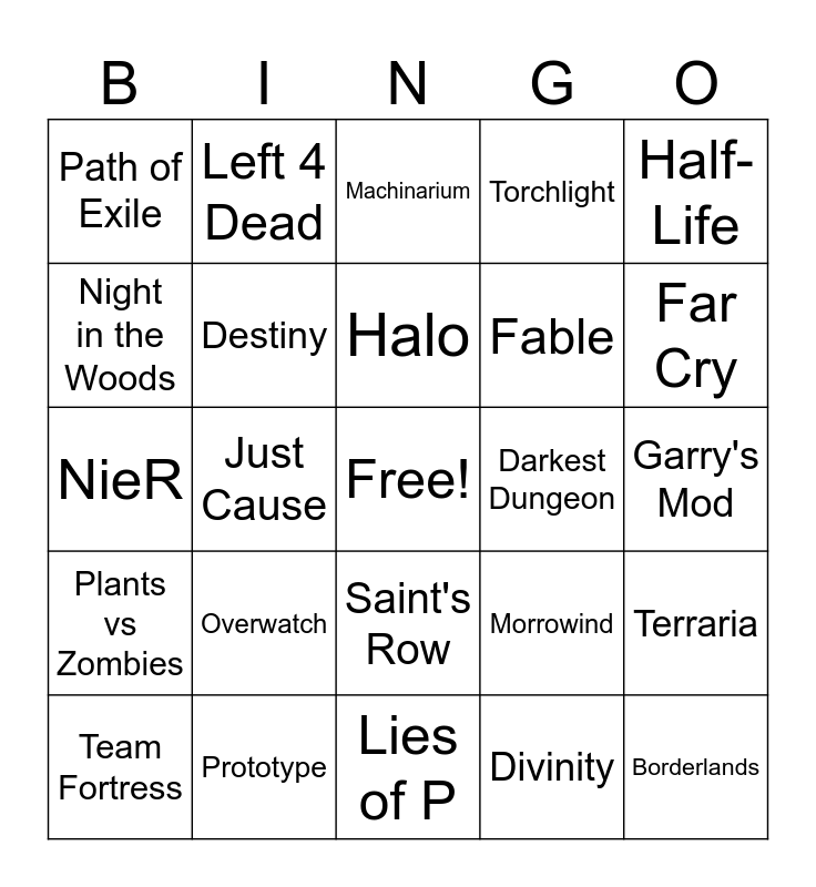 This bingo card has a free space and 24 words: Overwatch, Prototype, Halo, Team Fortress, Half-Life, Path of Exile, Night in the Woods, Left 4 Dead, Darkest Dungeon, Saint's Row, Fable, NieR, Morrowind, Terraria, Destiny, Divinity, Garry's Mod, Machinarium, Far Cry, Just Cause, Borderlands, Plants vs Zombies, Torchlight and Lies of P.