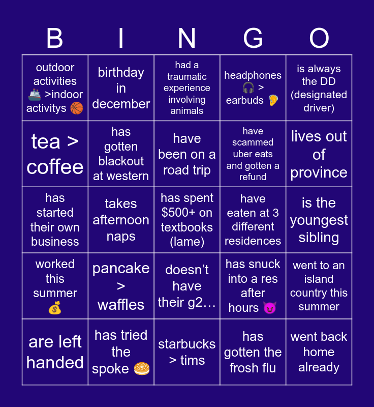 This bingo card has 30 words: are left handed, went to the hoco game, have been on a road trip, has a very interesting fun fact, is always the DD (designated driver), outdoor activities 🚢 >indoor activitys 🏀, birthday in december, doesn’t have their g2…, have eaten at 3 different residences, went back home already, worked this summer 💰, has gotten blackout at western, lives on res, has gotten the frosh flu, went to an island country this summer, cat >dog, takes afternoon naps, has spent $500+ on textbooks (lame), has snuck into a res after hours 😈, lives out of province, has started their own business, has tried the spoke 🥯, had a traumatic experience involving animals, have scammed uber eats and gotten a refund, is the youngest sibling, tea > coffee, pancake > waffles, starbucks > tims, headphones 🎧 > earbuds 🦻 and mustard > ketchup.