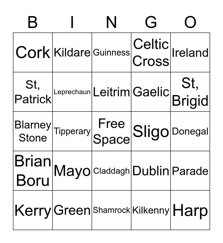 This bingo card has a free space and 24 words: Mayo, Green, Leitrim, Kerry, Ireland, Cork, St, Patrick, Kildare, Sligo, Claddagh, Gaelic, Blarney Stone, Dublin, Parade, Leprechaun, Kilkenny, Donegal, Guinness, St, Brigid, Tipperary, Harp, Brian Boru, Celtic Cross and Shamrock.