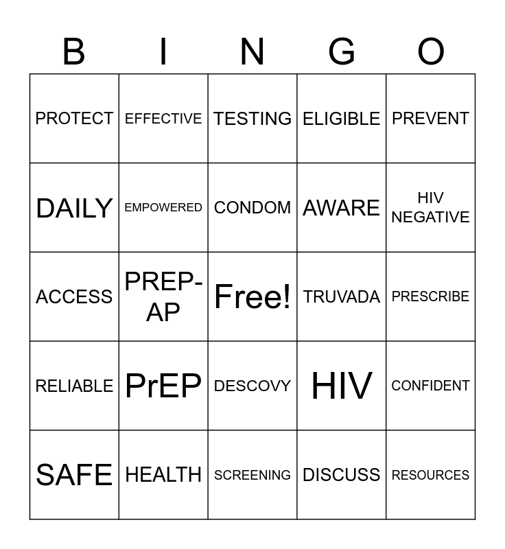 This bingo card has a free space and 24 words: PrEP, HEALTH, CONDOM, SAFE, PREVENT, PROTECT, DAILY, EFFECTIVE, TRUVADA, DESCOVY, AWARE, ACCESS, HIV, CONFIDENT, EMPOWERED, DISCUSS, PRESCRIBE, TESTING, HIV NEGATIVE, PREP-AP, RESOURCES, RELIABLE, ELIGIBLE and SCREENING.