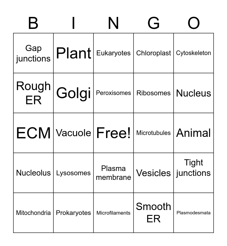This bingo card has a free space and 24 words: Lysosomes, Prokaryotes, Peroxisomes, Mitochondria, Cytoskeleton, Gap junctions, Rough ER, Plant, Microtubules, Plasma membrane, Ribosomes, ECM, Vesicles, Tight junctions, Golgi, Smooth ER, Animal, Eukaryotes, Nucleus, Vacuole, Plasmodesmata, Nucleolus, Chloroplast and Microfilaments.
